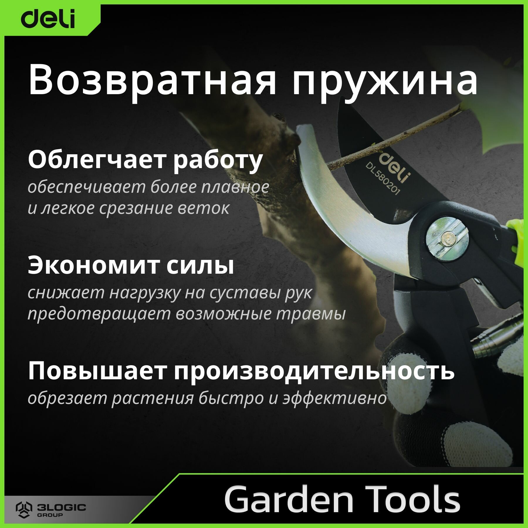 Инструменты ручные садовые режущие Deli Секатор садовый Deli DL580201 лезвия с тефлоновым покрытием, длина 207мм, макс. диаметр резки 18мм, сталь 55С