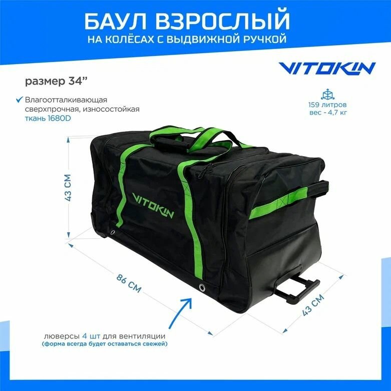 Купить Баул на колесах хоккейный с карманами и ручкой VITOKIN, размер 34" взрослый черный с зеленым