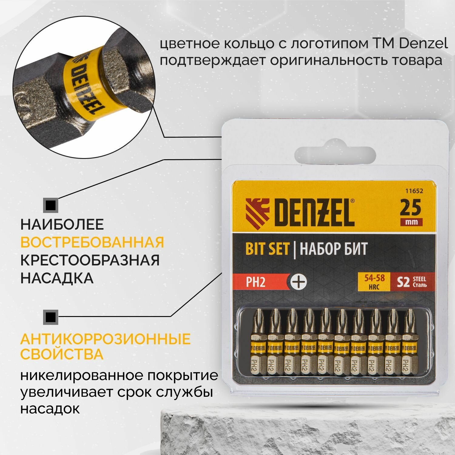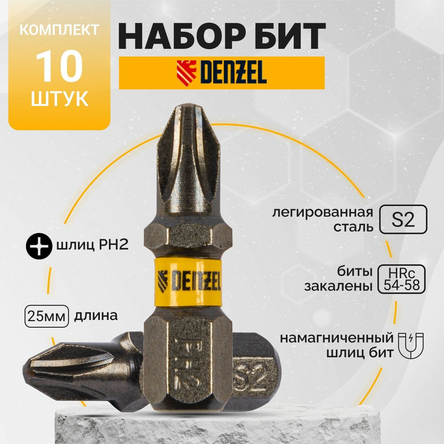 Набор бит PH2х25, сталь S2, шестигранный профиль, 10 шт.// Denzel 11652