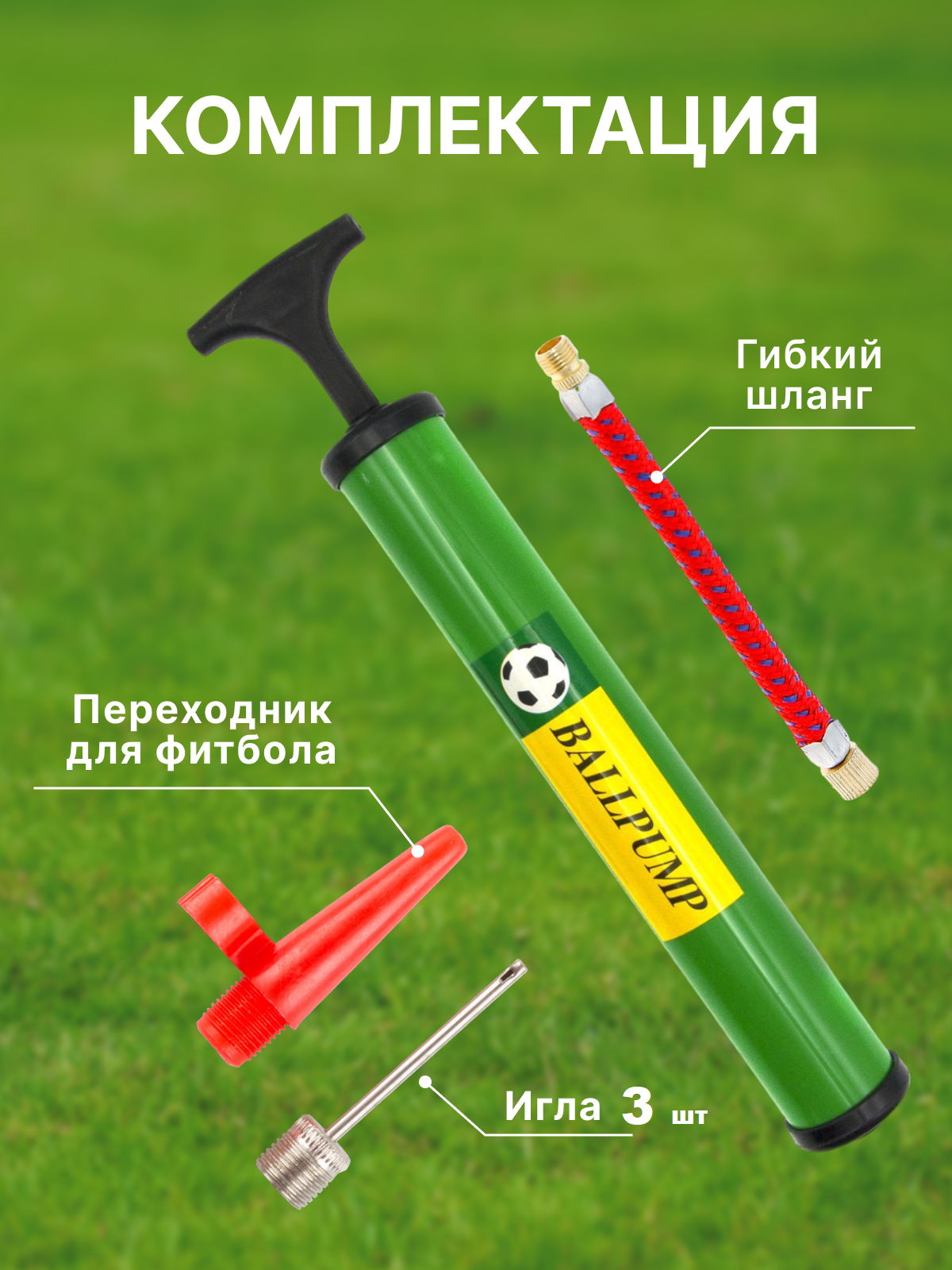 Насос для мячей 28 см, шланг + 3 иглы, 1 насадка, цвета микс интересное: