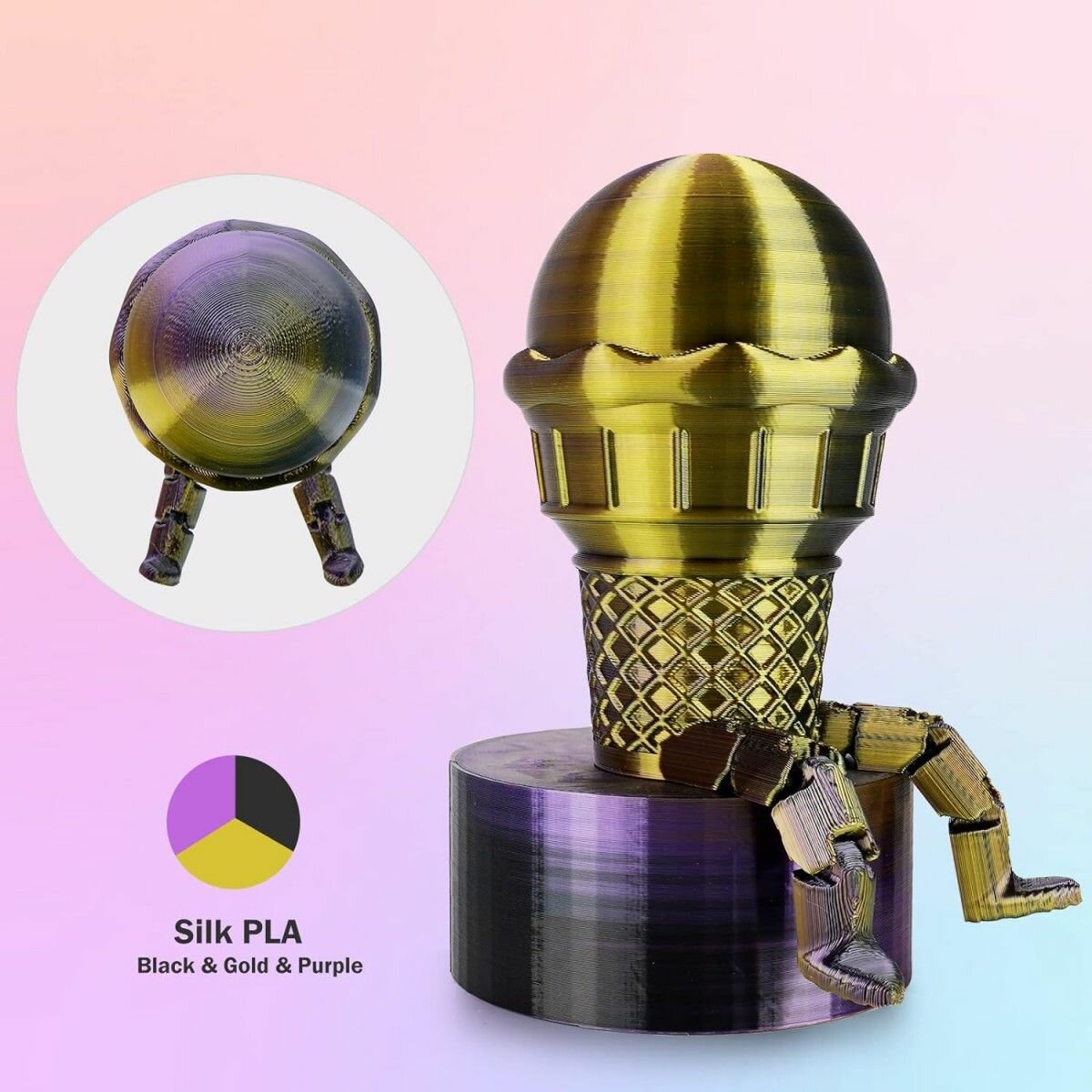 Ниже Вы можете прочитать отзывы на PLA Silk Tri-Color 1,75 мм 1 кг (Eryone) Черный - Золотой - Фиолетовый, ознакомится с подробными характеристиками, посмотреть интересные обзоры и фотографии на PLA Silk Tri-Color 1,75 мм 1 кг (Eryone) Черный - Золотой - Фиолетовый.