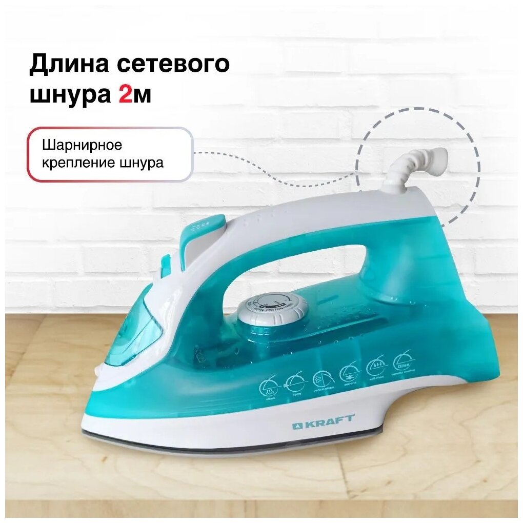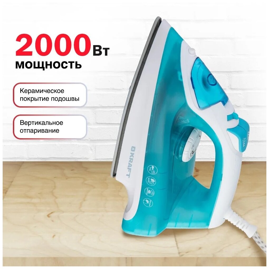 Утюг Kraft KF-CI20202, мощность 2000 Вт, подача пара до 30 г/мин, паровой удар до 120 г, голубой