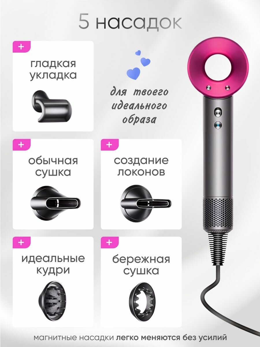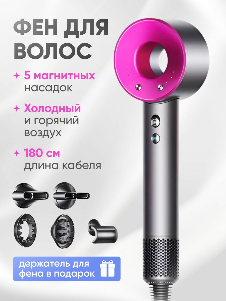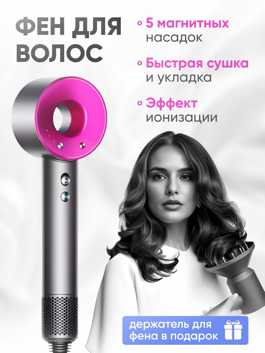 Фен для волос профессиональный с ионизацией с магнитными насадками 5штук/ мощный супер фен розовый/ фен лучший подарок на 8 марта /RU