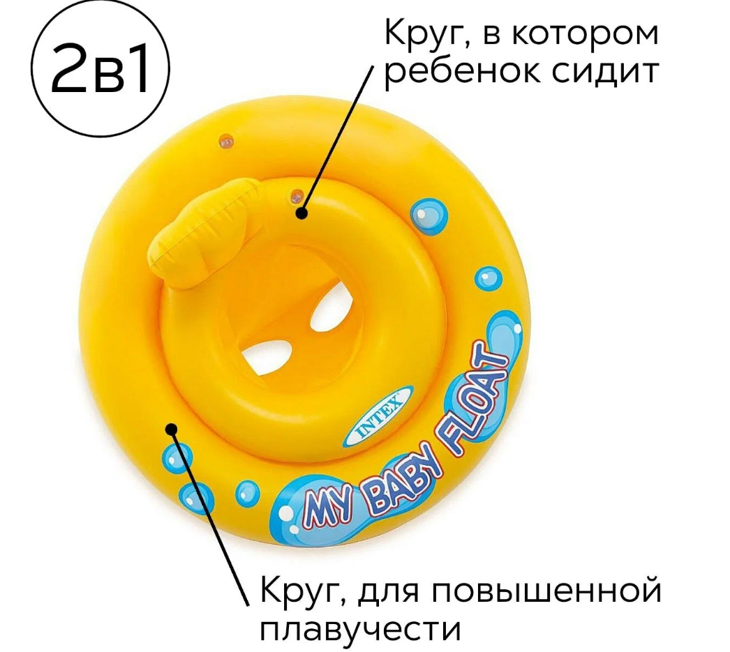 Купить Круг для плавания надувной детский INTEX Солнышко 67 см двухкольцевой, нагрузка до 15 кг, с отверстиями для ножек и спинкой, без насоса, желтый / 1 шт