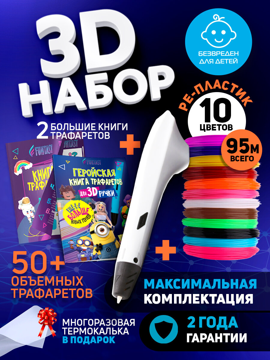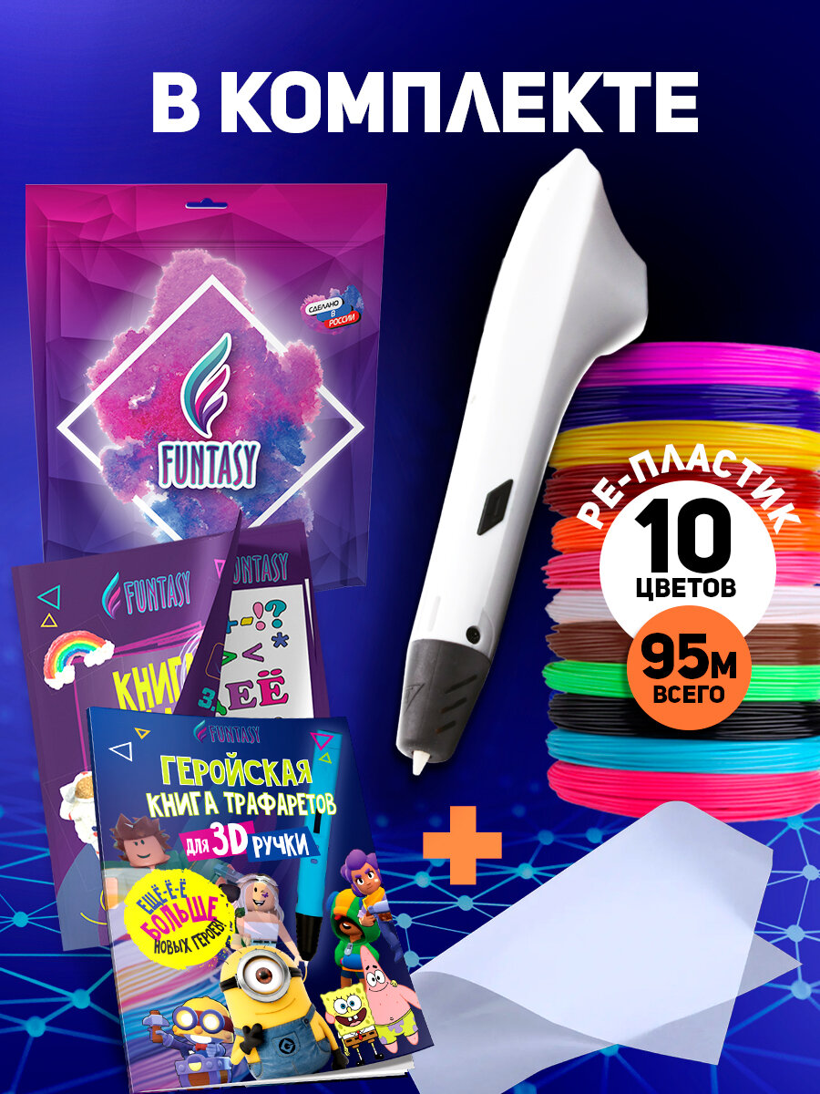 Купить Набор для 3Д творчества Funtasy 3D-ручка Simple + PE пластик 10 цветов + Книга с трафаретами Hero и VSE