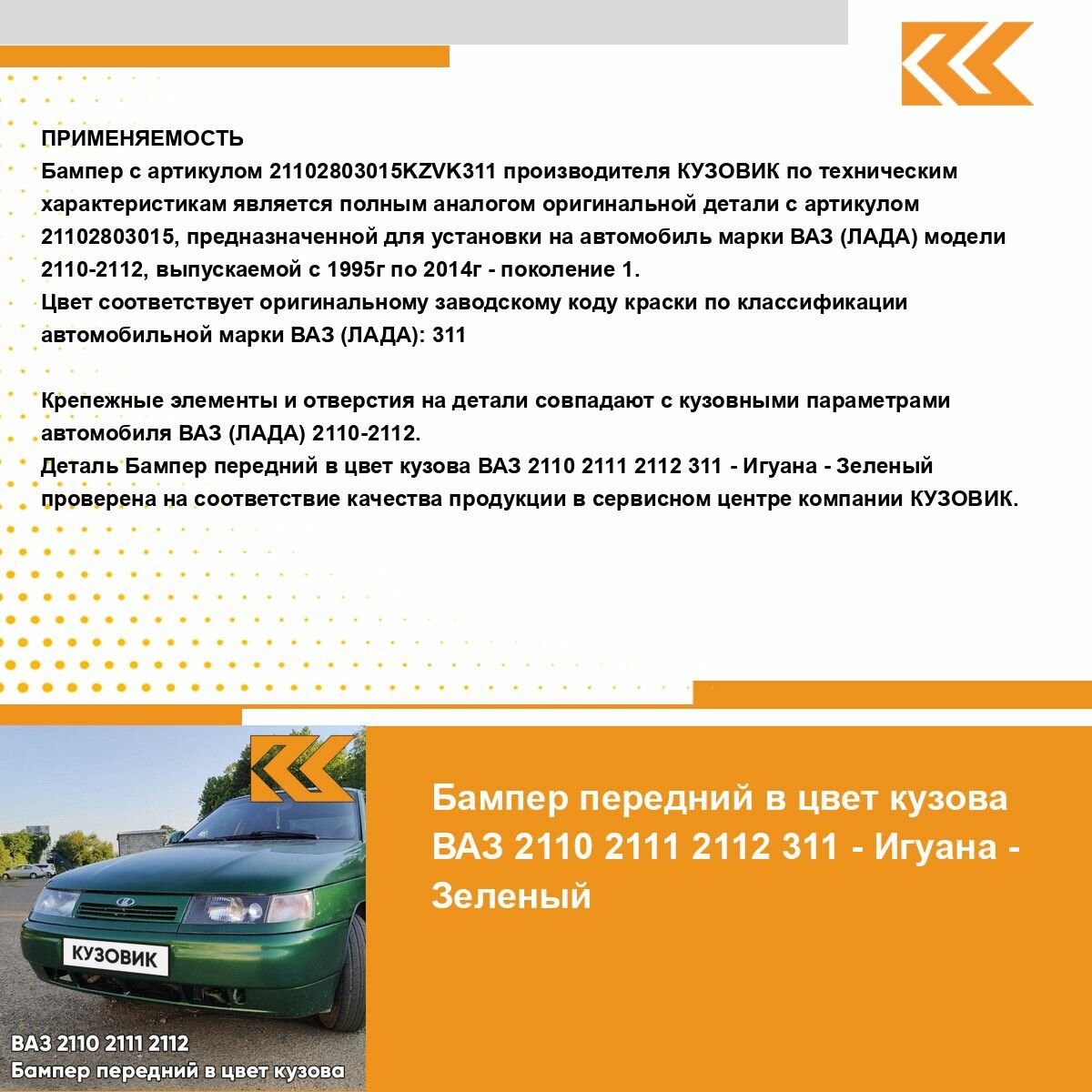 Ниже Вы можете прочитать отзывы на Бампер передний в цвет кузова ВАЗ 2110 2111 2112 311 - Игуана - Зеленый, ознакомится с подробными характеристиками, посмотреть интересные обзоры и фотографии на Бампер передний в цвет кузова ВАЗ 2110 2111 2112 311 - Игуана - Зеленый.
