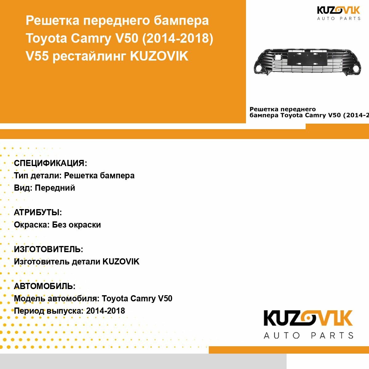 Ниже Вы можете прочитать отзывы на Решетка переднего бампера Toyota Camry V50 Тойота Камри В50 (2014-2018) V55 рестайлинг под российский номер с хром молдингом, ознакомится с подробными характеристиками, посмотреть интересные обзоры и фотографии на Решетка переднего бампера Toyota Camry V50 Тойота Камри В50 (2014-2018) V55 рестайлинг под российский номер с хром молдингом.
