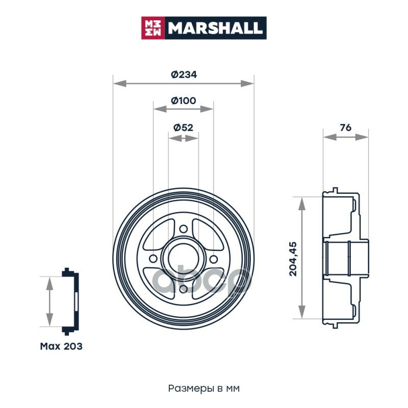 Барабан тормозной Renault Logan 04-, Sandero 07-, Symbol 08- D=203 мм (+ABS) Marshall MARSHALL M1900902 | цена за 1 шт