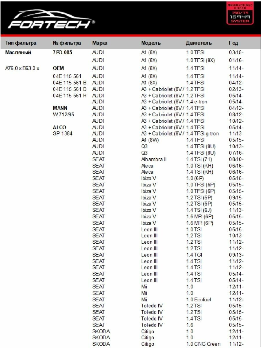 Фильтр Масляный Vag+Skoda 2012-> Mot.1.2tfsi/1.4tfsi Fortech Fo-085 Fortech арт. FO-085 интересное: