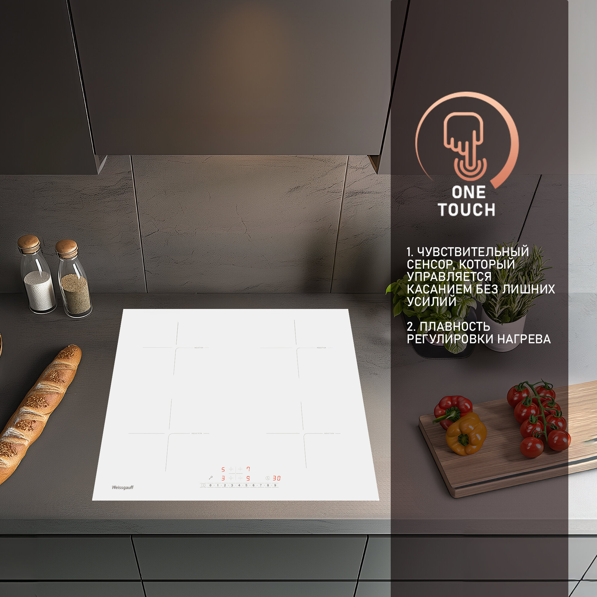 Индукционная варочная панель с инвертором и слайдером Weissgauff HI 632 W,3 года гарантии, Непрерывный нагрев,Сенсорное управление, Блок управления Слайдер, 9 уровней мощности, Таймер, Мощность 7000 Вт, Индикация остаточного тепла, 59 см ширина