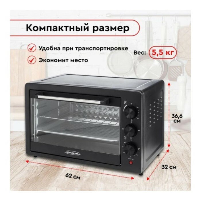 Мини-печь Волжанка ПЧ-48Ч, 1500 Вт, 48 л, 60-230 °C, таймер, чёрная