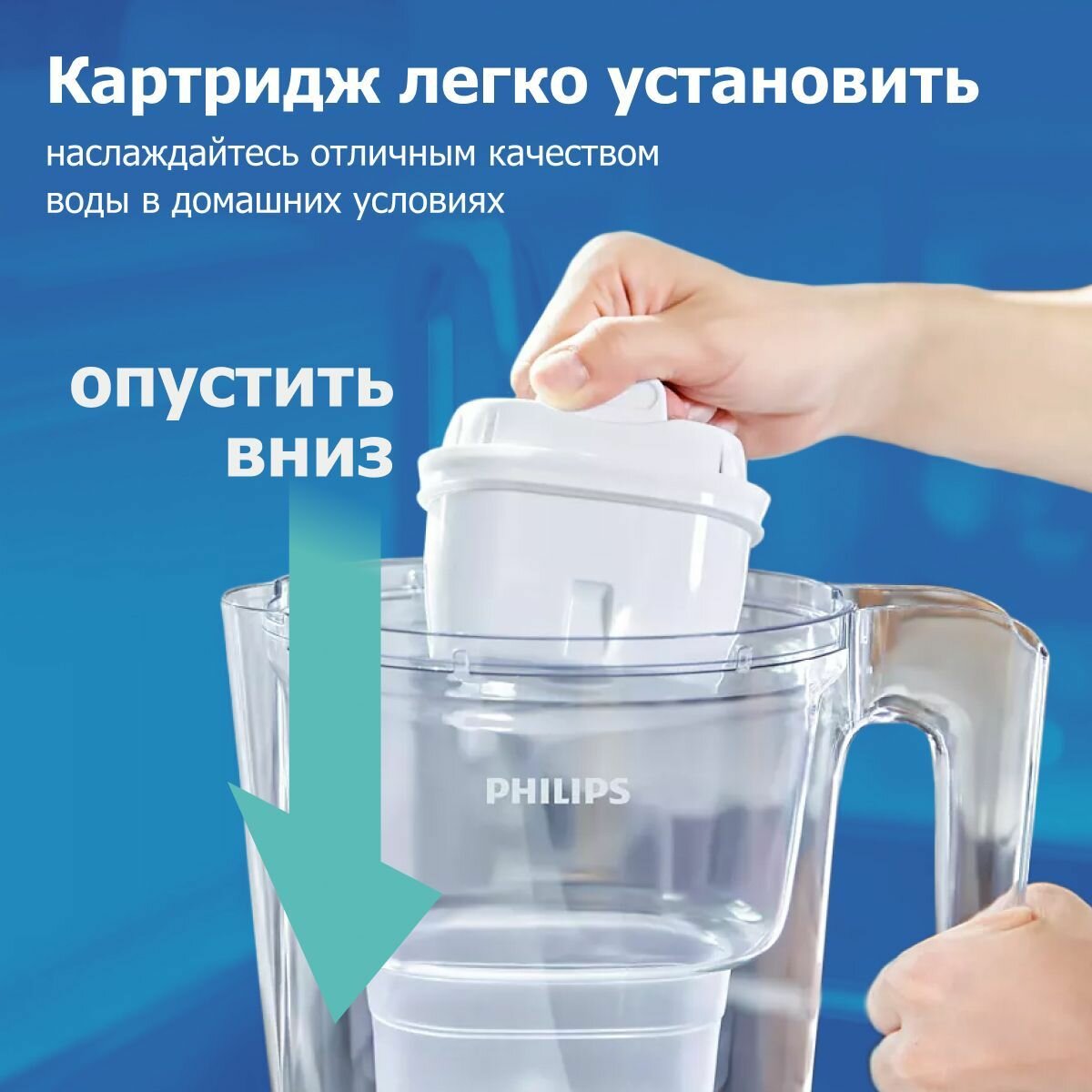 Комплект кувшин Philips AWP2936BLT с картриджем внутри, 3 л, цифровой таймер + сменный универсальный картридж Philips AWP210 (1 шт), задерживает хлор, известь, тяжелые металлы, микропластики и пфок