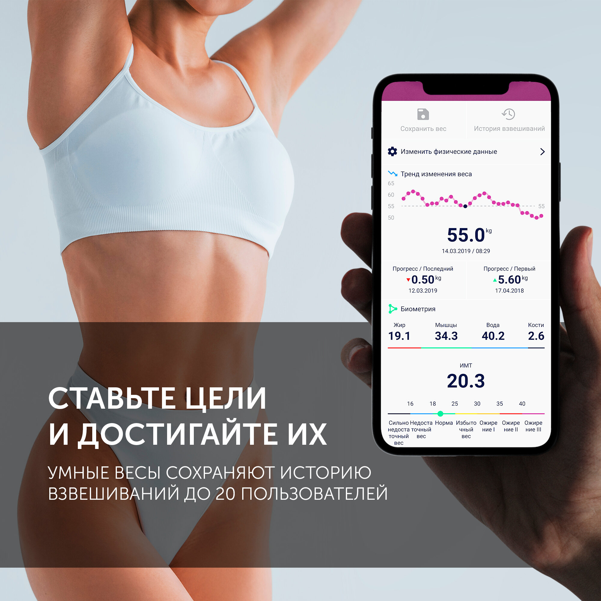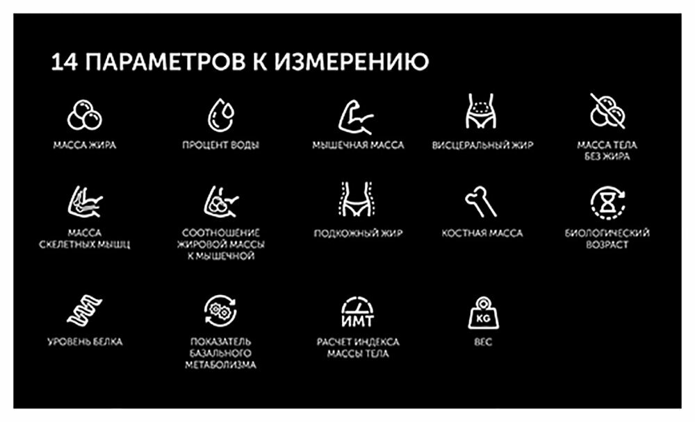 | Дополнительные функции | определение доли воды / определение доли жировой ткани / определение доли костной ткани / определение доли мышечной ткани / память / расчет ИМТ (BMI) |