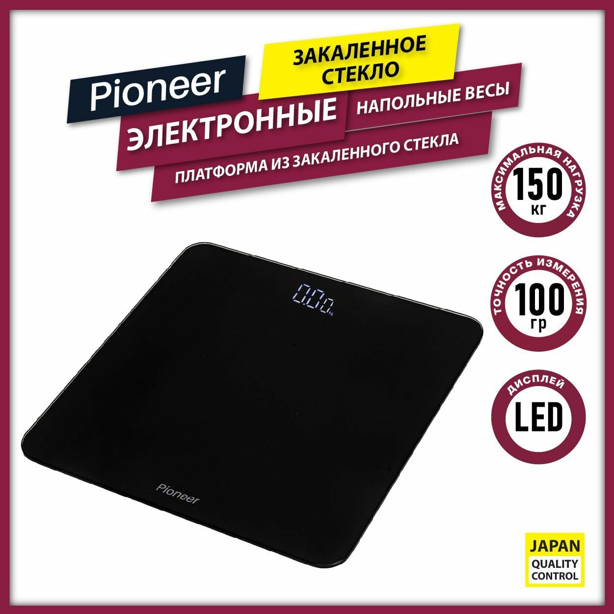 Напольные весы электронные Pioneer PBS1005 с LED-дисплеем и платформой из закаленного стекла, нагрузка до 150 кг, автовыключение