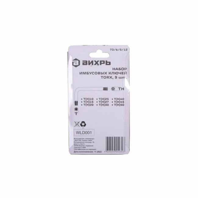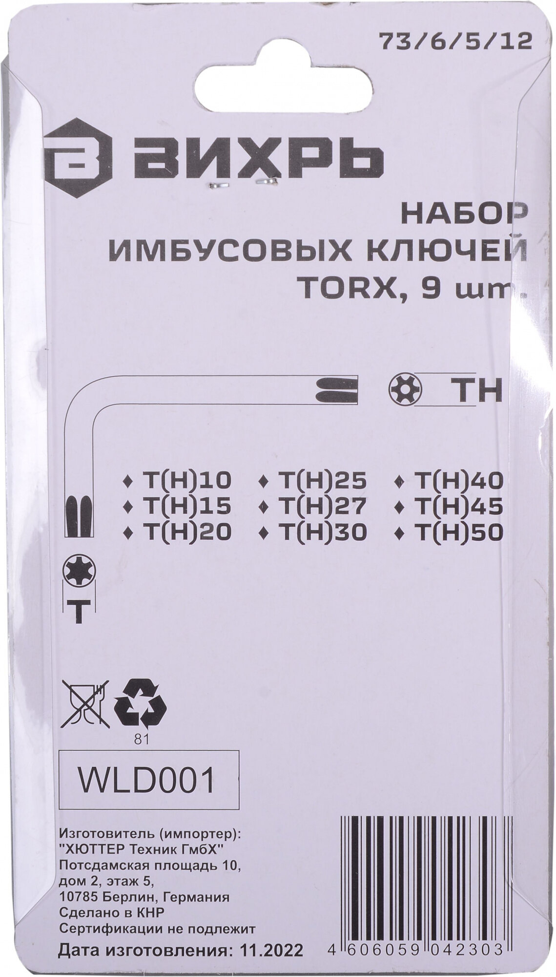 Набор имбусовых ключей Вихрь Torx , 9 шт, T10-T50, 73/6/5/12