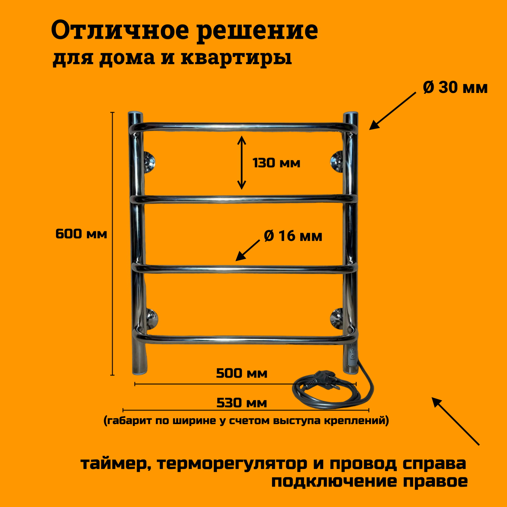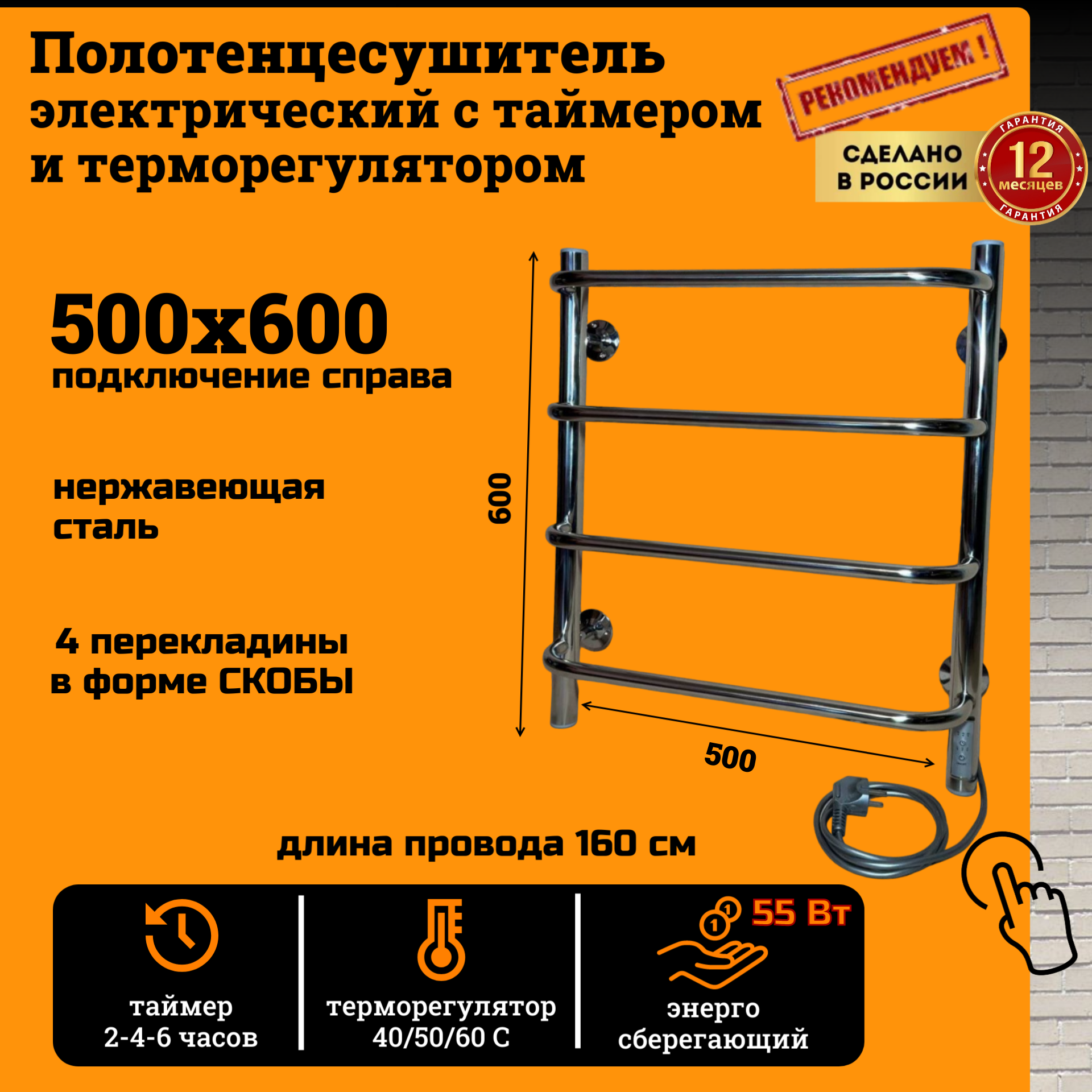 Полотенцесушитель электрический РуДизайн Лесенка скоба нерж. 500х600 таймер и подключение справа интересное: