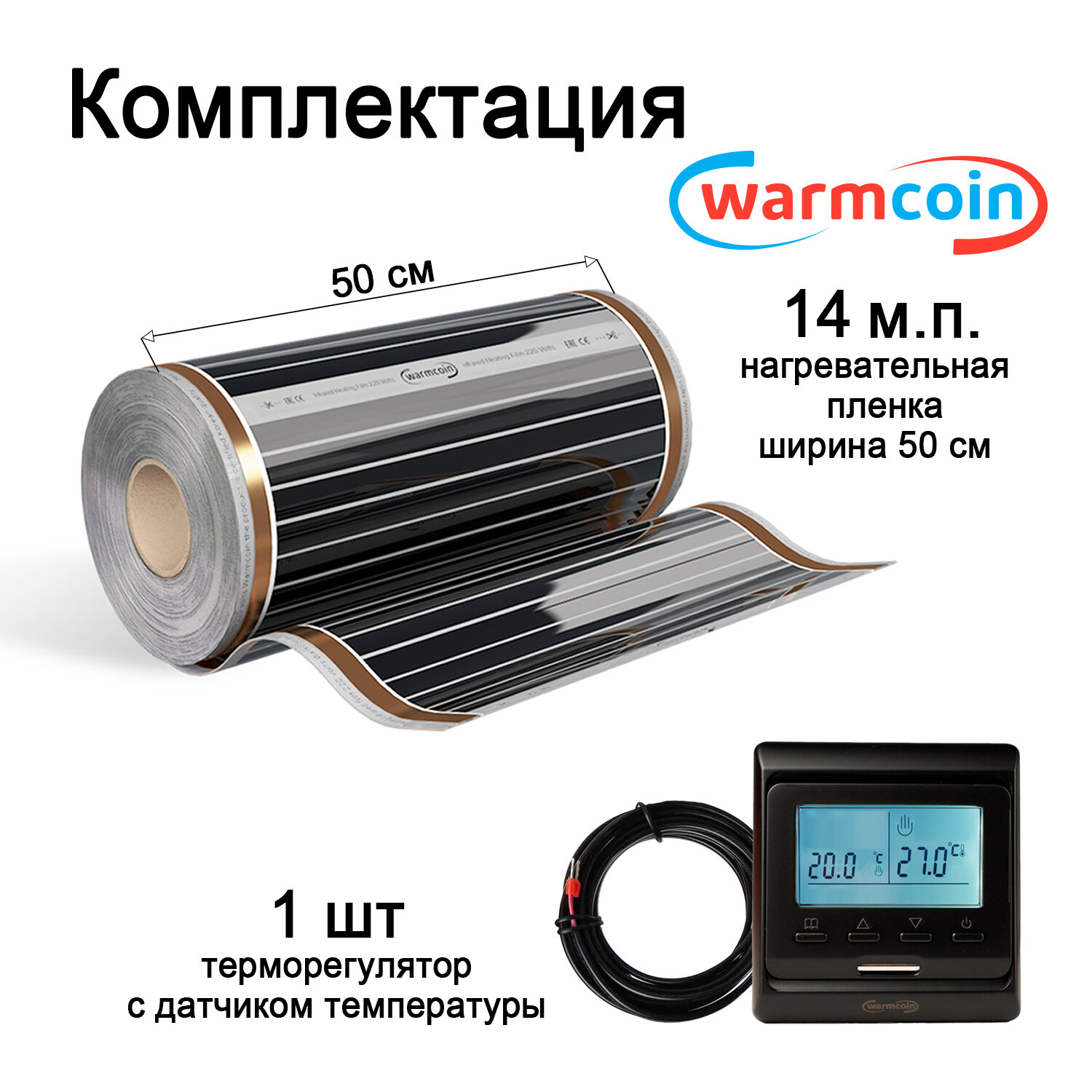 Теплый пол Warmcoin инфракрасный 50см, 220 Вт/м. кв. с черным электронным терморегулятором, 14 м. п
