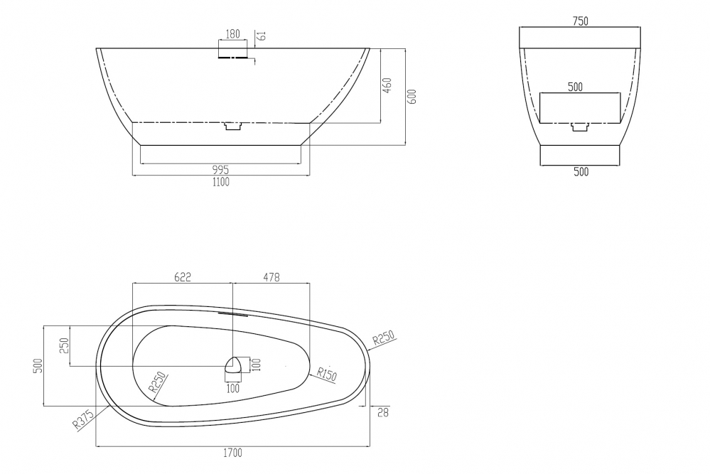 Ванна из искусственного камня Abber Dortmund 170x75 AM9911B Черная без гидромассажа