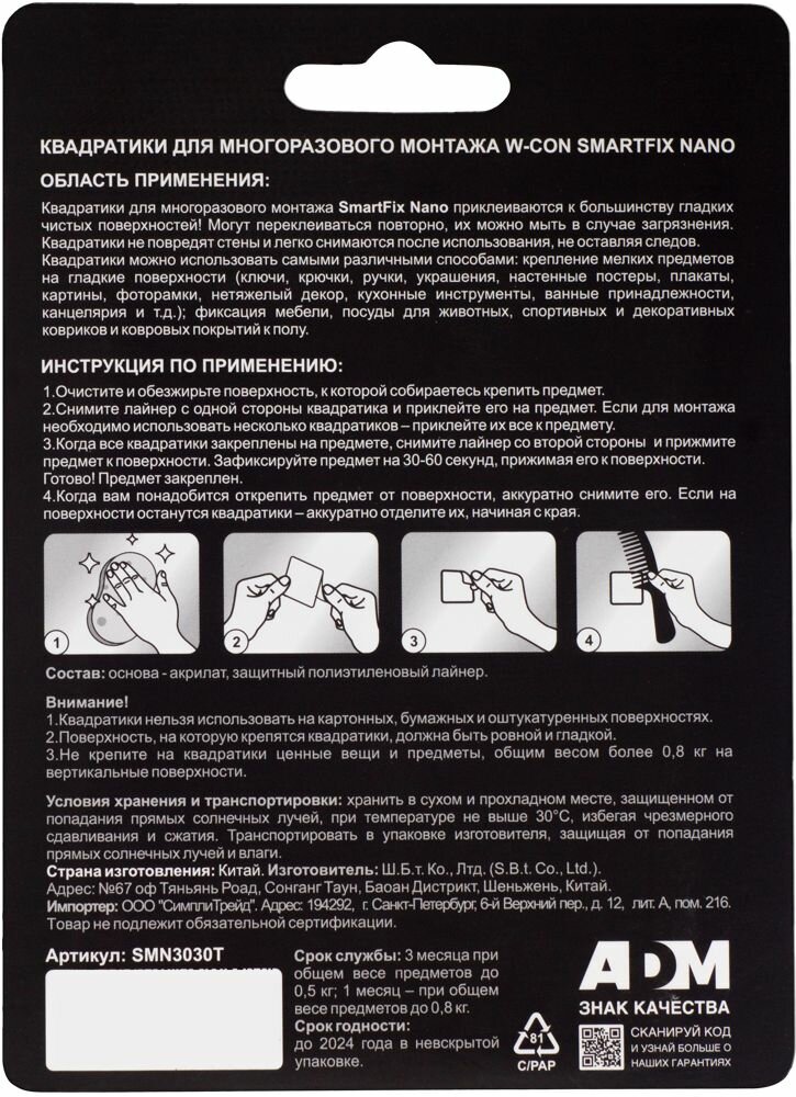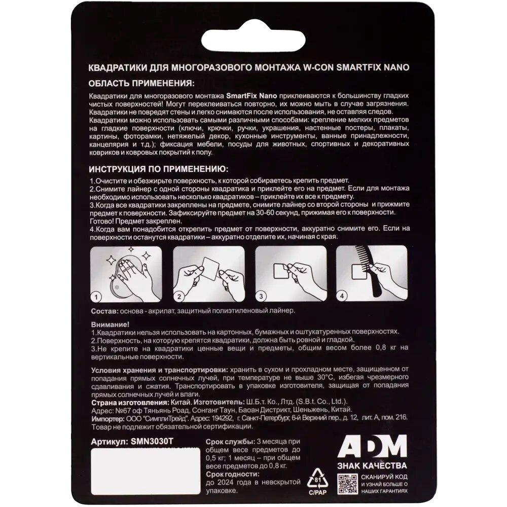 Квадраты для многоразового монтажа W-con SmartFix NANO, 3 х 3 см, 12 штук интересное: