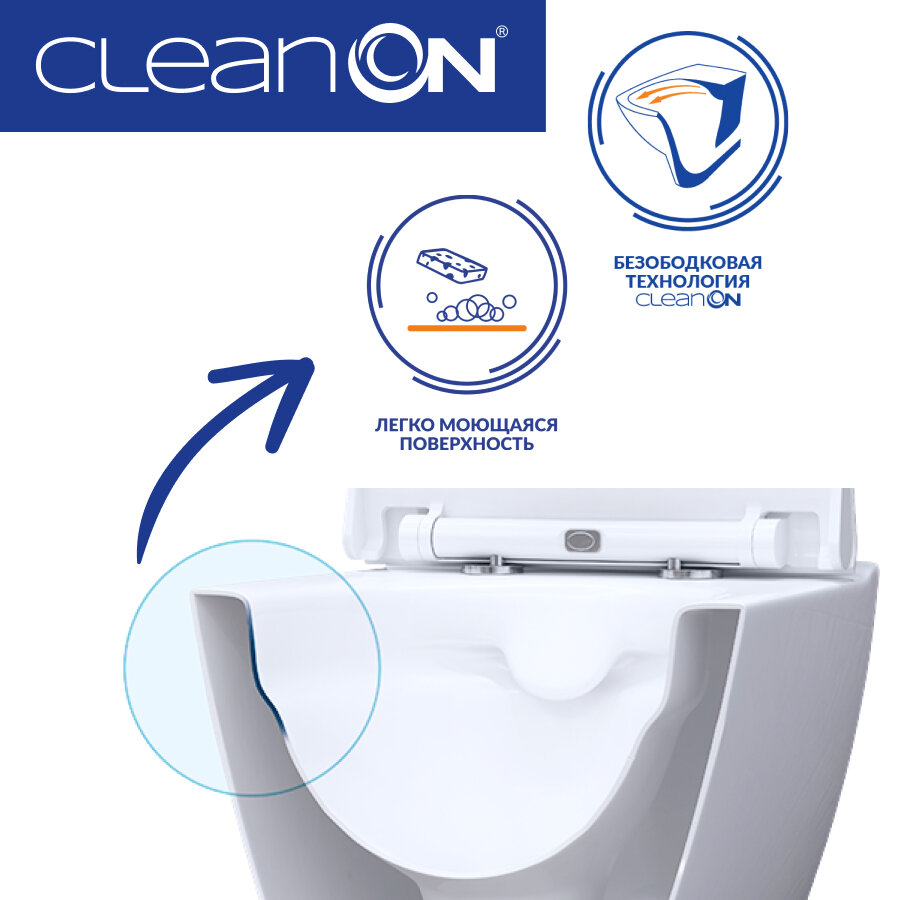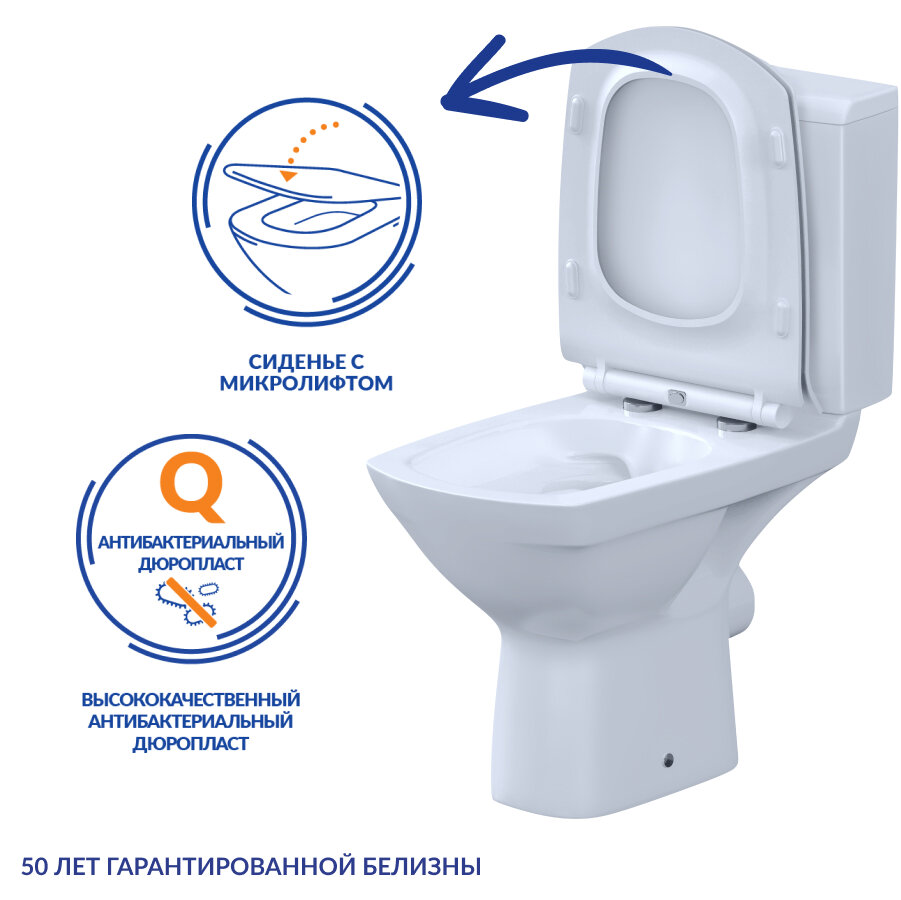 | Дополнительная информация | Унитаз керамический безободковый, горизонтальный выпуск; бачок смывной керамический с нижним подводом воды; двухуровневый спускной механизм; сиденье для унитаза из дюропласта ультратонкое легкосъемное с функцией плавного закрывания; монтажный комплект; инструкция/гарантийный талон |