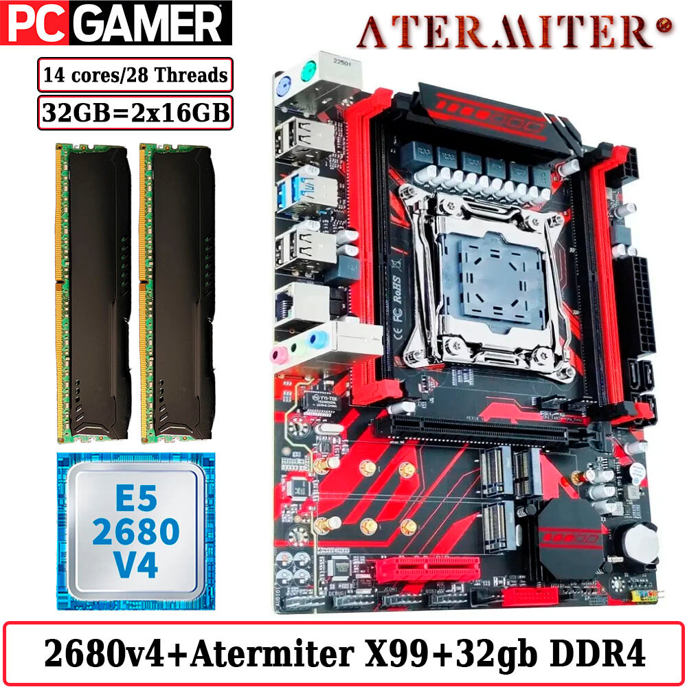 Комплект материнская плата Atermiter X99 D4 + Xeon 2680V4 + 32GB DDR4 ECC REG 2x16GB RED