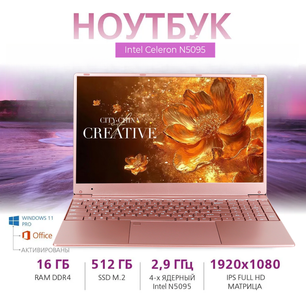Ноутбук 15.6", Intel Celeron N5095 (2.0 ГГц), RAM 16 ГБ, SSD 512 ГБ, Intel UHD Graphics, Windows Pro, Розовый, Русская раскладка