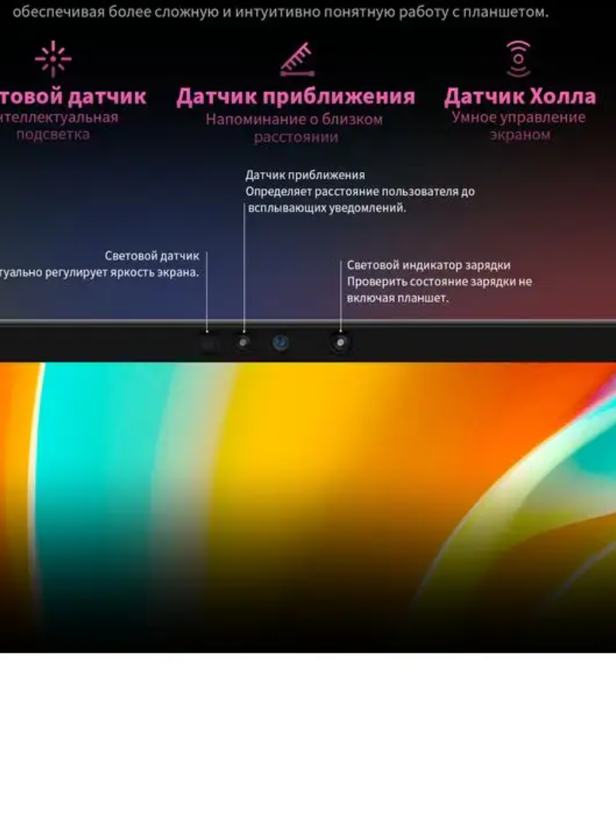 | Особенности | cлот для карты памяти / акселерометр / встроенный микрофон / гироскоп / датчик Холла / датчик освещенности / датчик приближения / детский планшет / разблокировка по лицу |