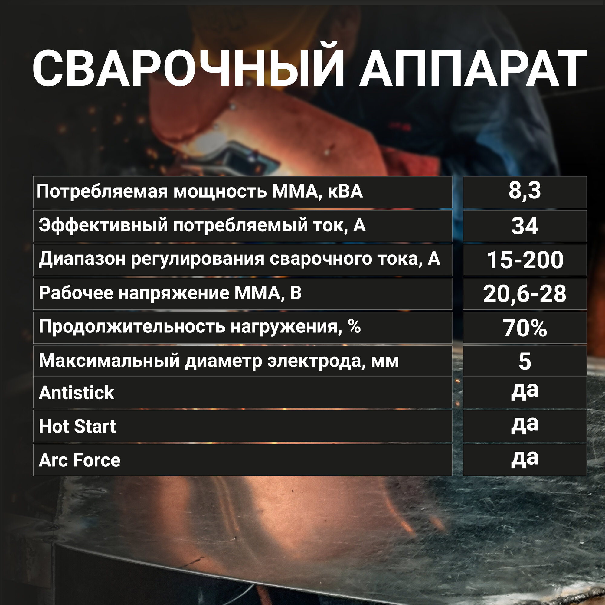 | Дополнительные функции | антиприлипание / горячий старт / защита от перегрева / форсаж дуги |