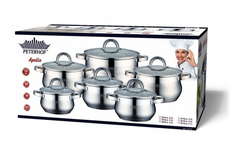 Набор кастрюль PETERHOF PH-15235 12 предметов 2,1/2,9/2,9/3,9/3,9/6,5 л. интересное: