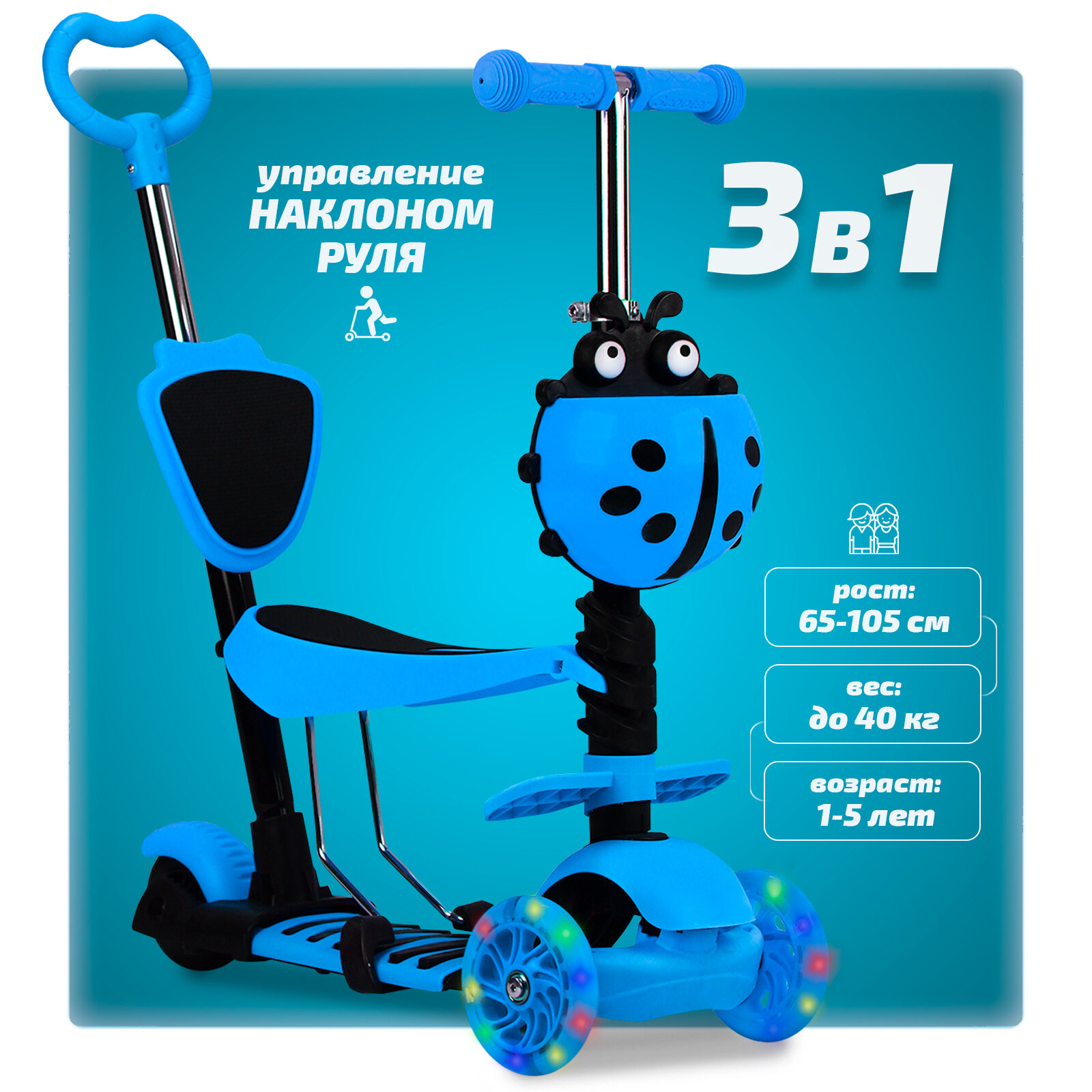 Купить Самокат детский трехколесный 3 в 1 до 5 лет голубой со светящимися колесами
