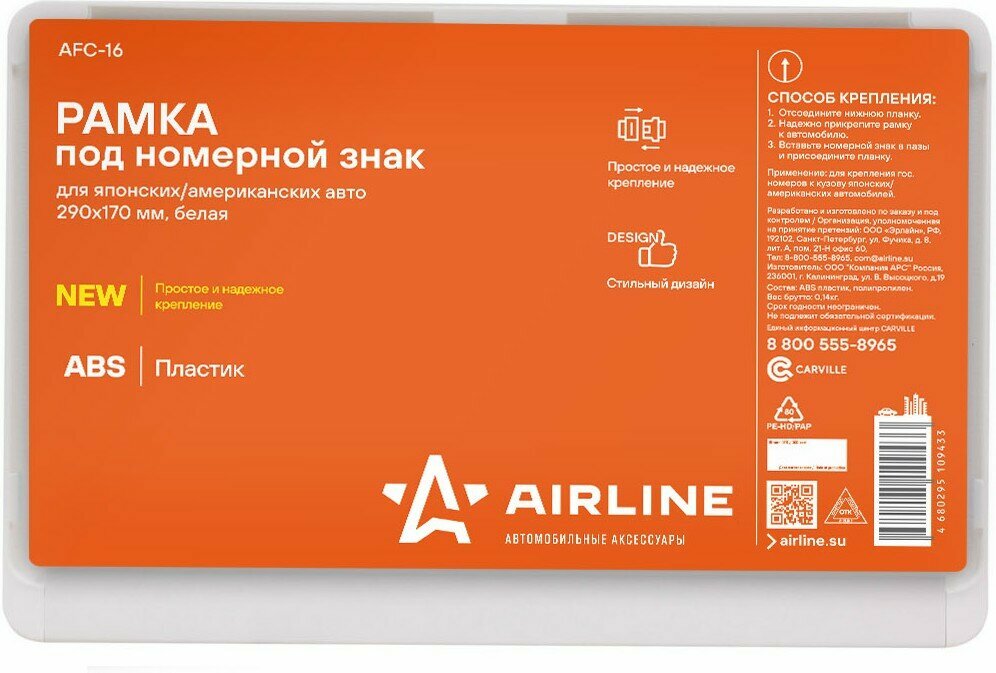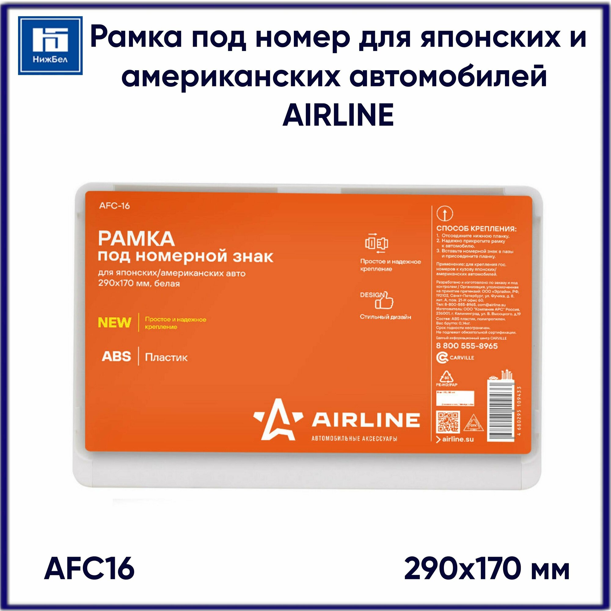AIRLINE AFC-16 Рамка номерного знака для япон./амер. авто, 290 х 170 мм, белая Airline