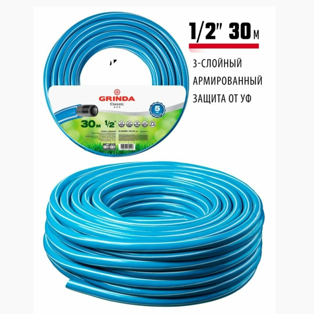 Поливочный шланг GRINDA Classic 1/2, 30 м, 25 атм, трёхслойный, армированный 8-429001-1/2-30
