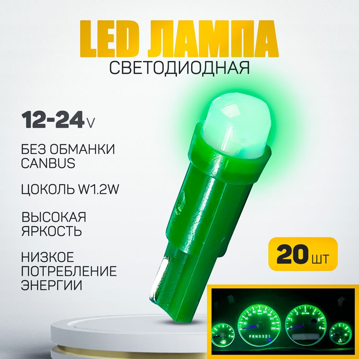 Купить Светодиодная лампа T5 W1,2W . Подсветка панели приборов (Зеленый цвет) 12V LED (20шт)
