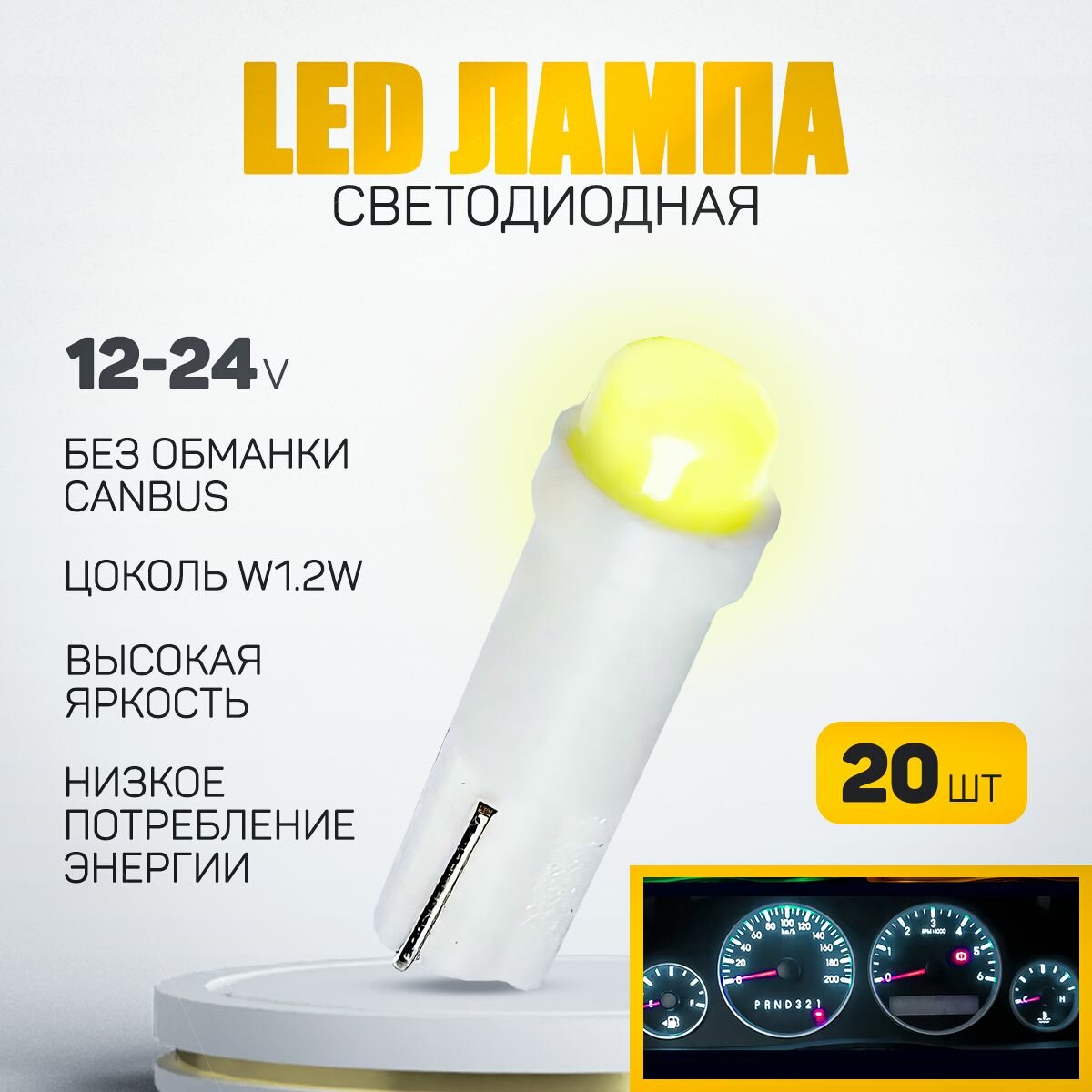 Купить Светодиодная лампа T5 W1,2W . Подсветка панели приборов (белый цвет) 12V LED (20шт)