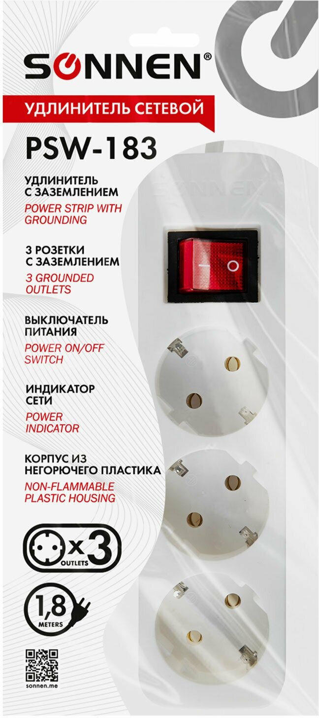 Удлинитель сетевой SONNEN PSW-183, 3 розетки c заземлением, выключатель 10 А, 1,8 м, белый
