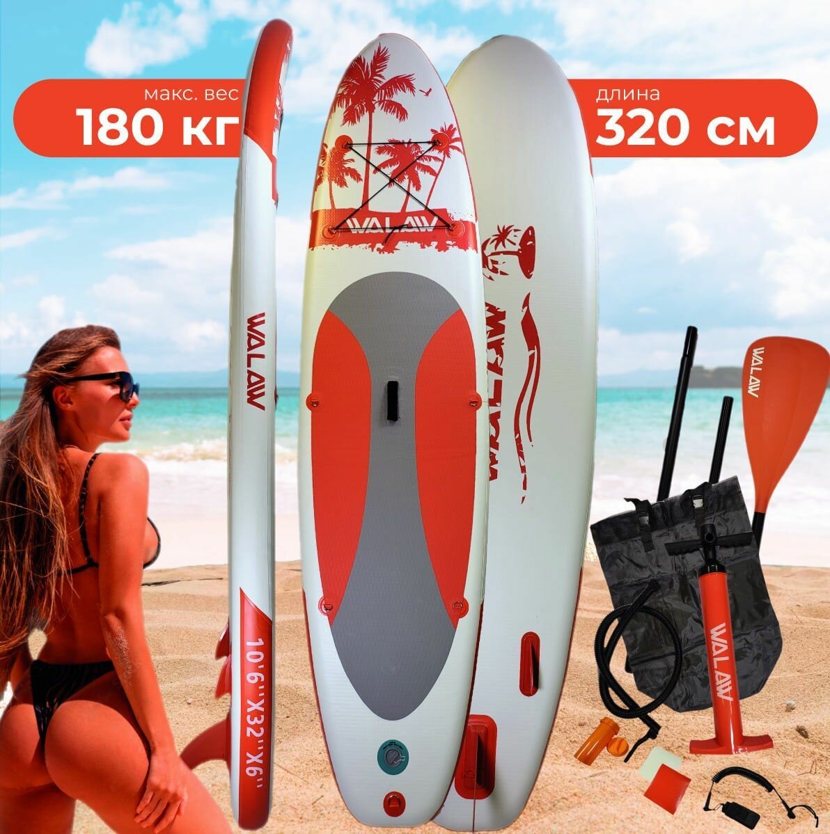 Надувная SUP-доска WALAW RED 320*81*15 см, полный комплект интересное: