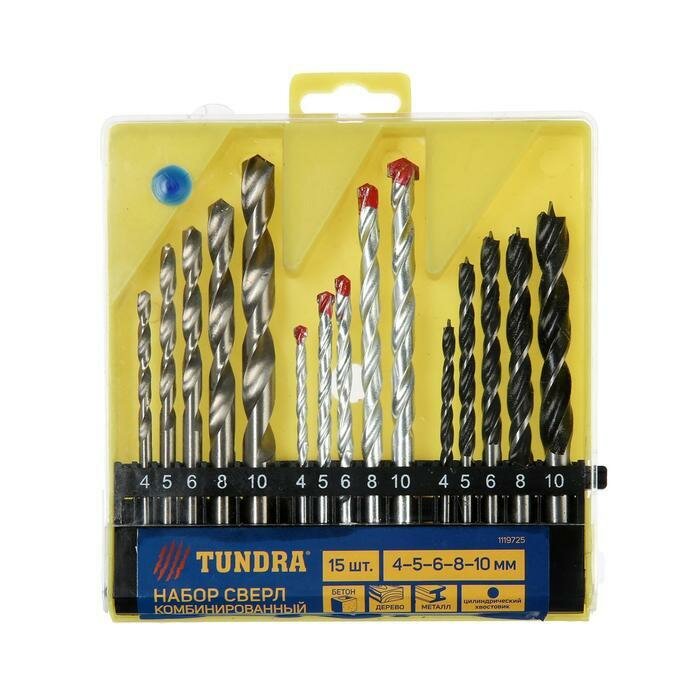 Купить Тундра Набор сверл комбинированный тундра, цилиндрический хвостовик, 4-5-6-8-10 мм, 15 шт.