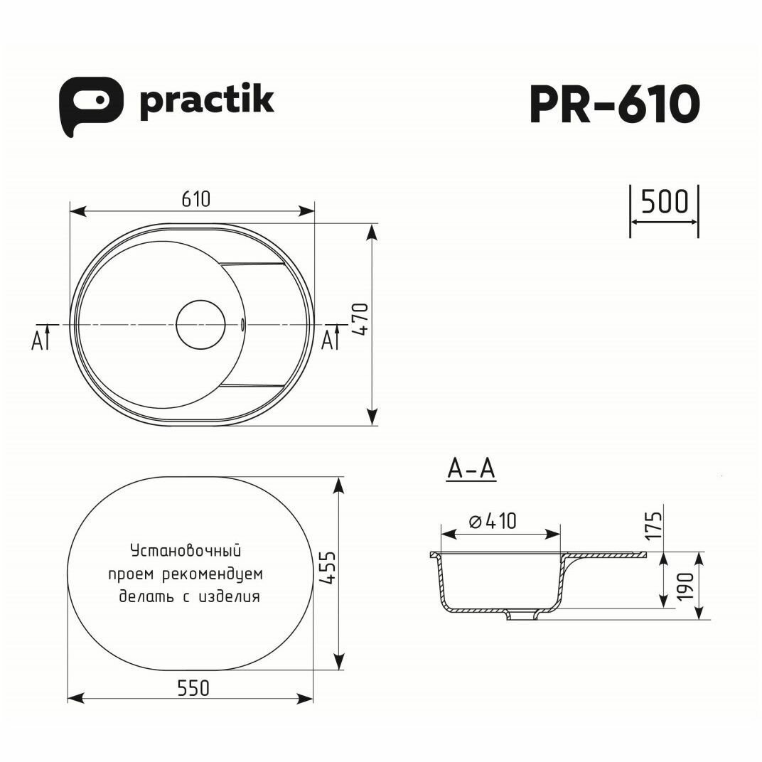 Мойка кухонная Practik из искусственного камня овальная без сифона PR-M-610, цвет: черный оникс, база: 55х45.5 см, арт. PR-M-610-004 интересное: