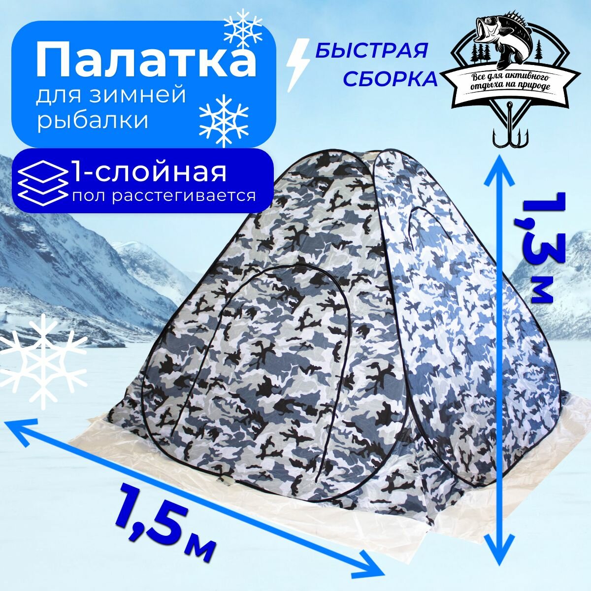 Палатка для зимней рыбаки 1,5 х 1,5м, КМФ, белая, однослойная, 2 места