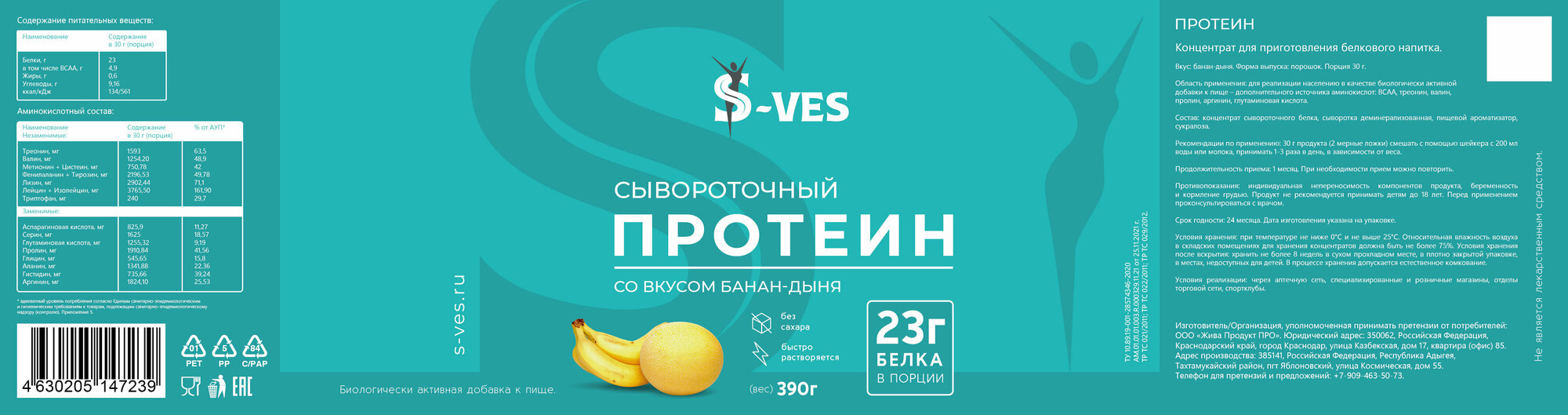 Купить Сывороточный протеин-концентрат банан-дыня S-VES Здоровый продукт 390 грамм