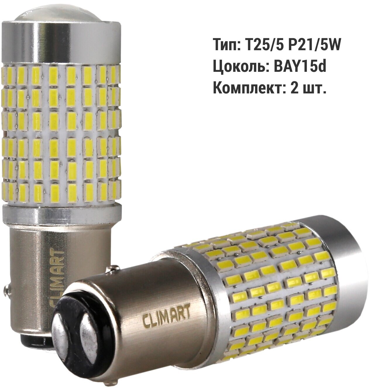 Лампа светодиодная P21/5W / T25/5 автомобильная 2 шт, 12V, 5000K для стоп сигналов и ДХО в габариты Clim Art