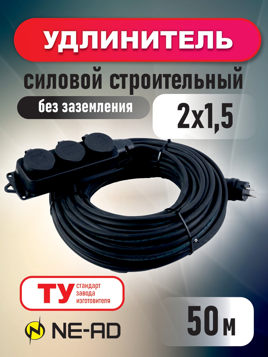 Удлинитель силовой строительный без заземления NE-AD 2x1,5-50m-IP44 50 метров 3 розетки 16А интересное: