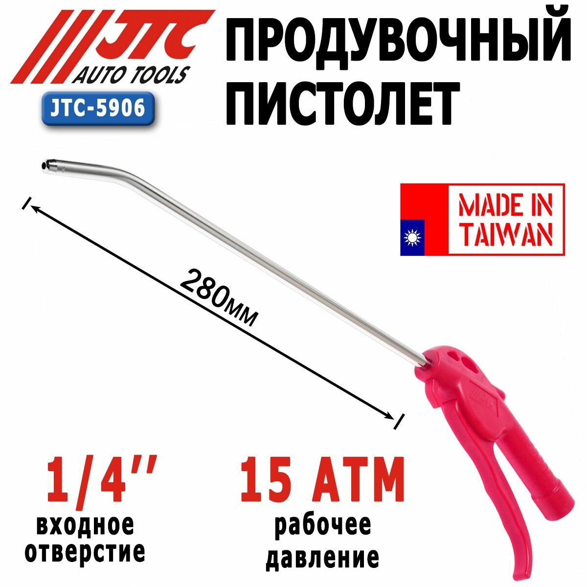 Пневмопистолет продувочный, длина трубки 280мм, входное отверстие 1/4, рабочее давление до 15кг/см3 JTC / арт. JTC5906 - (1 шт)