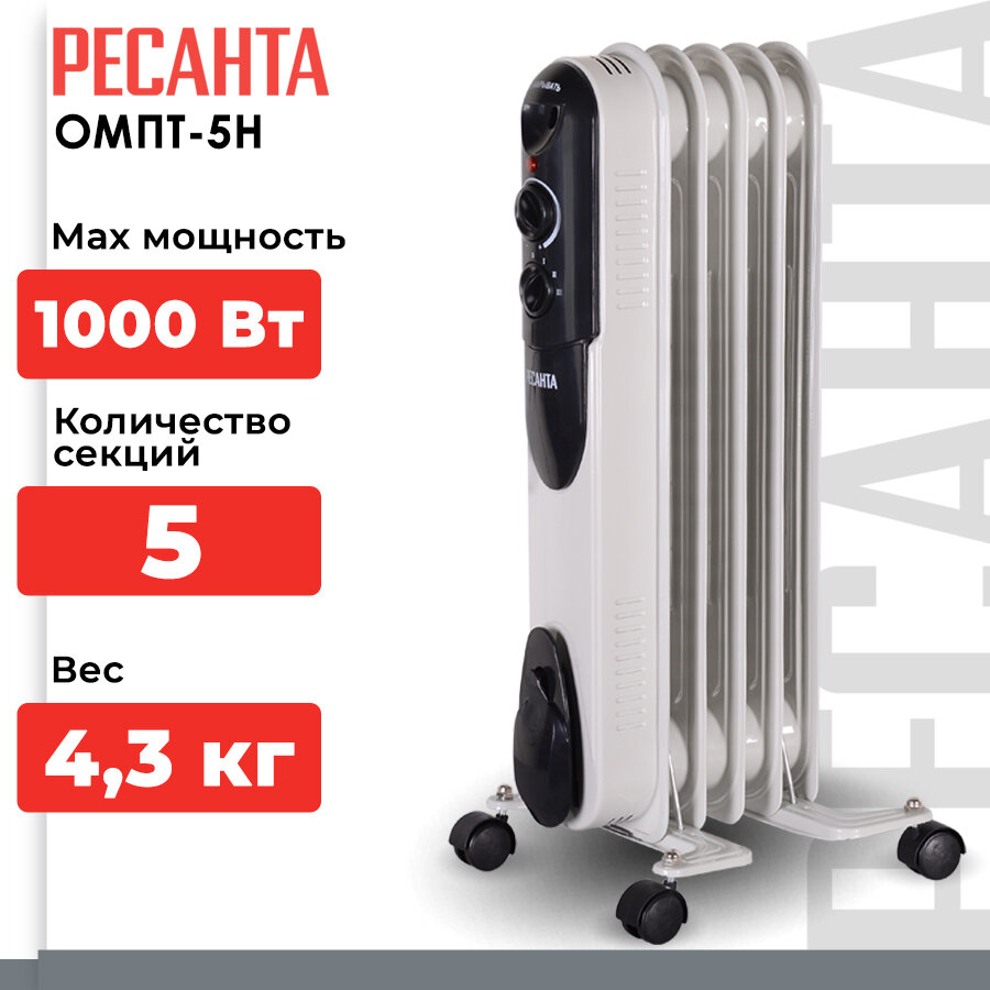 Масляный обогреватель Ресанта ОМПТ-5Н, 5 секций, 1000 Вт