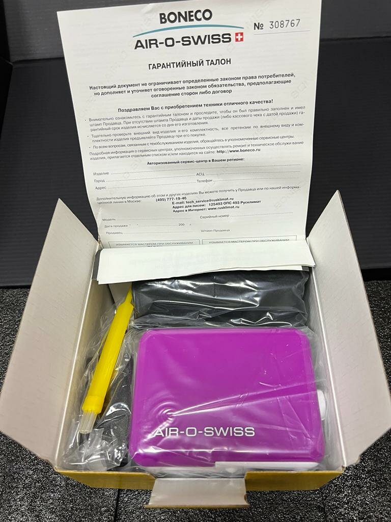 В общем покупка данного увлажнителя - деньги на ветер, тем более сейчас он стоит более 3500 рублей. Купили в магазине другой аппарат китайского производства мнее чем за 3000 руб. с резервуаром более 4л LED дисплеем, электронным управлением таймером и гигростатом так тот "кочегарит" паром ого-го !!! На максимальной производительности после работы всю ночь ощущения в комнате 15м2 как "ёжик в тумане", а Boneco Air-O-Swiss U7146 это так больше для самоуспокоения. Не советую брать. |