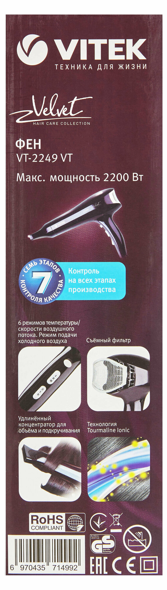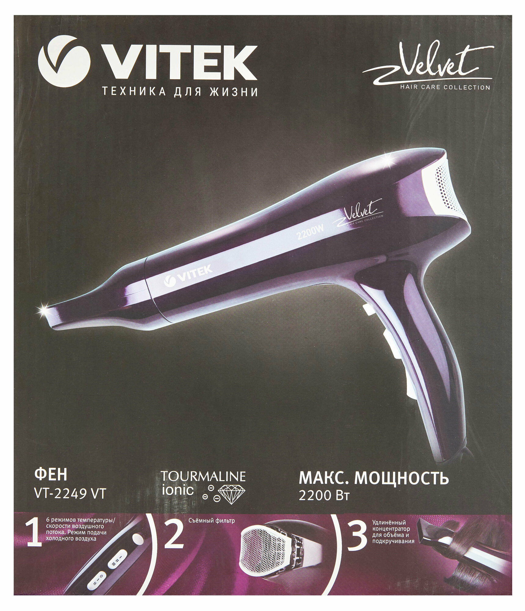 Фен VITEK VT-2249 Velvet фиолет, 2200 Вт, 6 режимов, турмалиновое покрытие