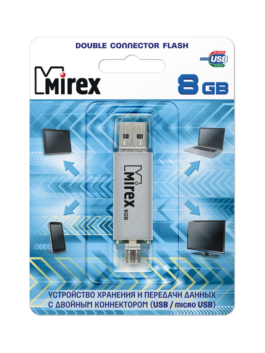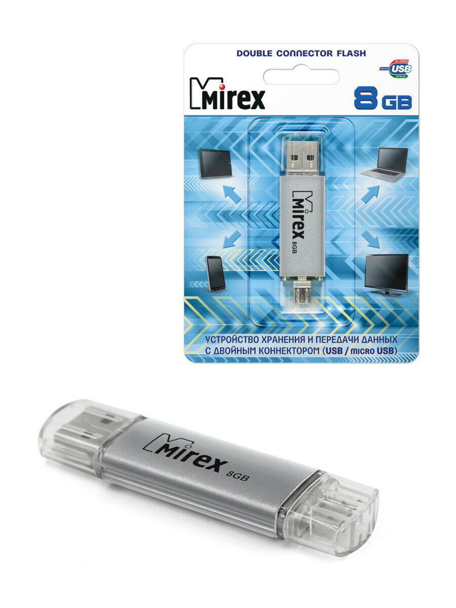 Double Connector Flash Mirex SMART SILVER 8GB, флешка Micro USB для смартфона и компьютера, поддержка OTG