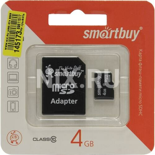 Карта памяти SmartBuy microSDHC 4GB class10 + SD адаптер