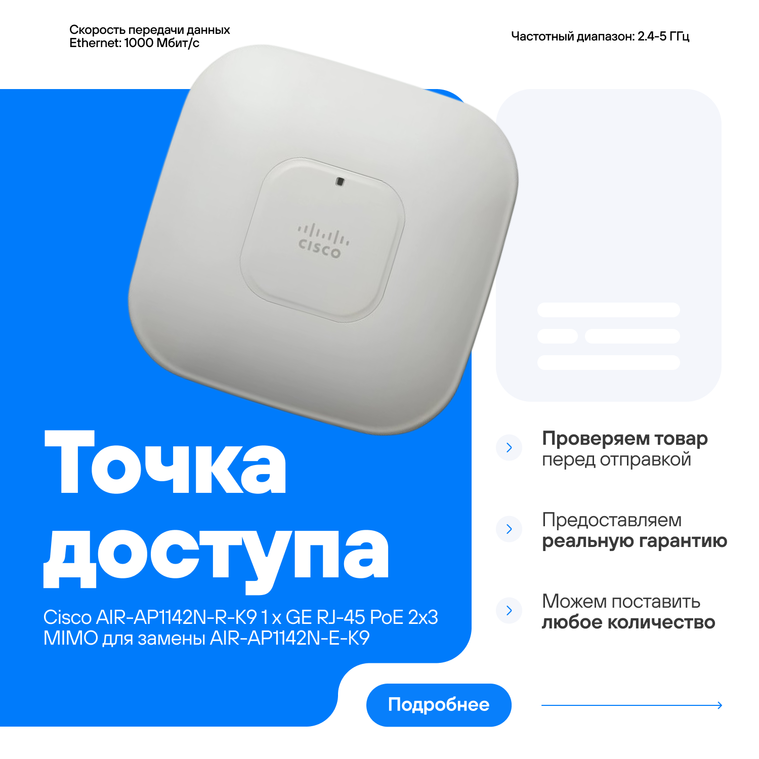 Точка доступа Сisco AIR-AP1142N-R-K9 1 x GE RJ-45 PoE 2x3 MIMO интересное: