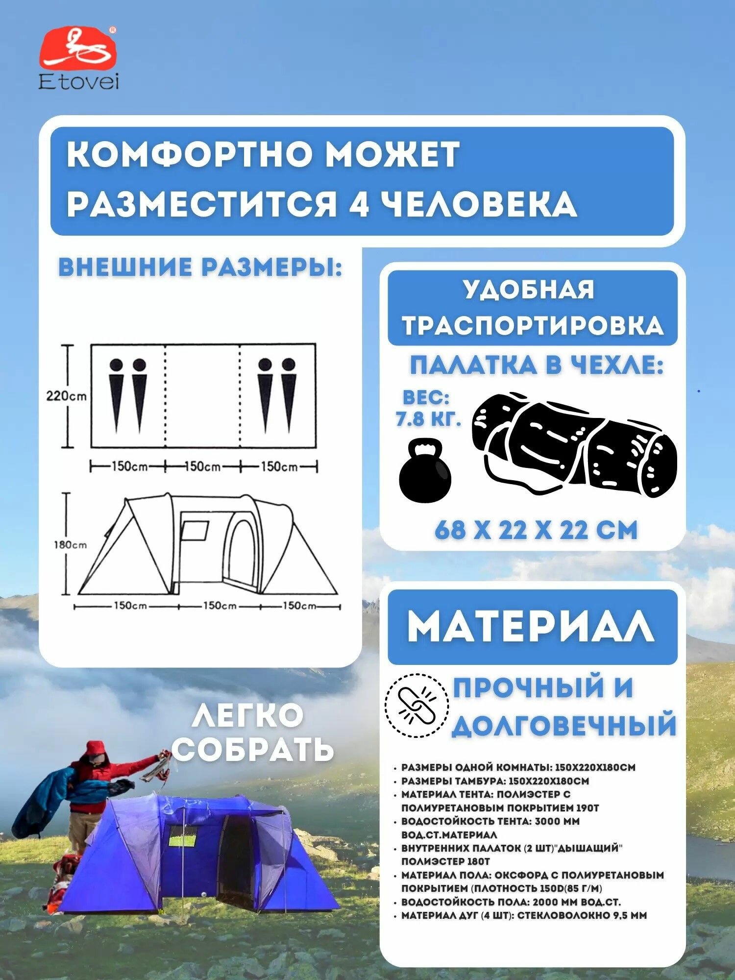 | Водостойкость тента | 3000 мм в.ст. |